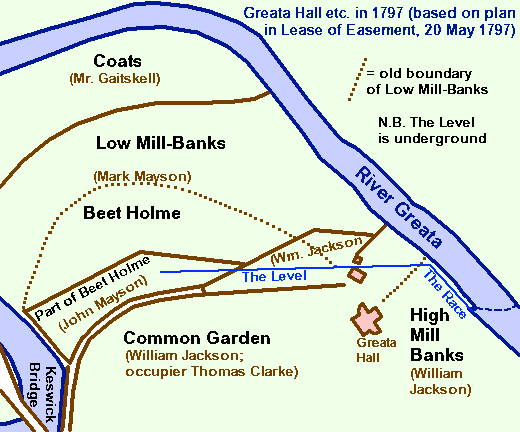 | 21: Building of Greta Lodge | See page 40 notes on Greta Hall adverts; NB the phrase "erected four years ago" appears in both the Cumberland Pacquet and Carlisle Patriot versions of the July advertisememt. The unnamed building marked on the plan accompanying a Lease of Easement [Wordsworth Trust, Greta Hall deeds 20] dated 20 May 1797 (in which William Jackson of Greata Hall allows John Mayson of Portinscale to convey water from the river by a level underneath his property to Mayson's new mills on the site of the present pencil works, in exchange for a right of road over Mayson's property) appears to match quite precisely with the oddly skewed north-west corner of Greta Lodge, suggesting that at least part of that structure may be incorporated in the house. I confess that I don't quite know what to make of reports in the letters of Samuel Taylor Coleridge in 1802 ["Collected Letters of Samuel Taylor Coleridge" Volume 2, edited by Earl L. Griggs, (1956/1966)] about the building of a "new house" at or adjacent to Greta Hall (notably letter to RS, 2 Sep 1802); the fact that Mr Jackson remained resident in the hall itself, and that no other neighbouring tenant is subsequently mentioned by any of the Coleridges suggests that this was not Greta Lodge. Here is a rough version of the 1797 plan on a topographical base of the 1st edition Ordnance Survey 1:2,500 (rescaled).